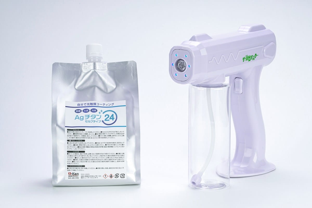 光触媒コーティングAGチタン24セルフは、薬液を噴霧することで抗菌・除菌・防カビ効果が24h・長期間持続する新時代の光触媒コーティング。これまで光触媒は専門業者でないと施工が難しいものでしたが、光触媒コーティングAGチタン24セルフは初心者でも簡単・リーズナブルに施工が可能です。