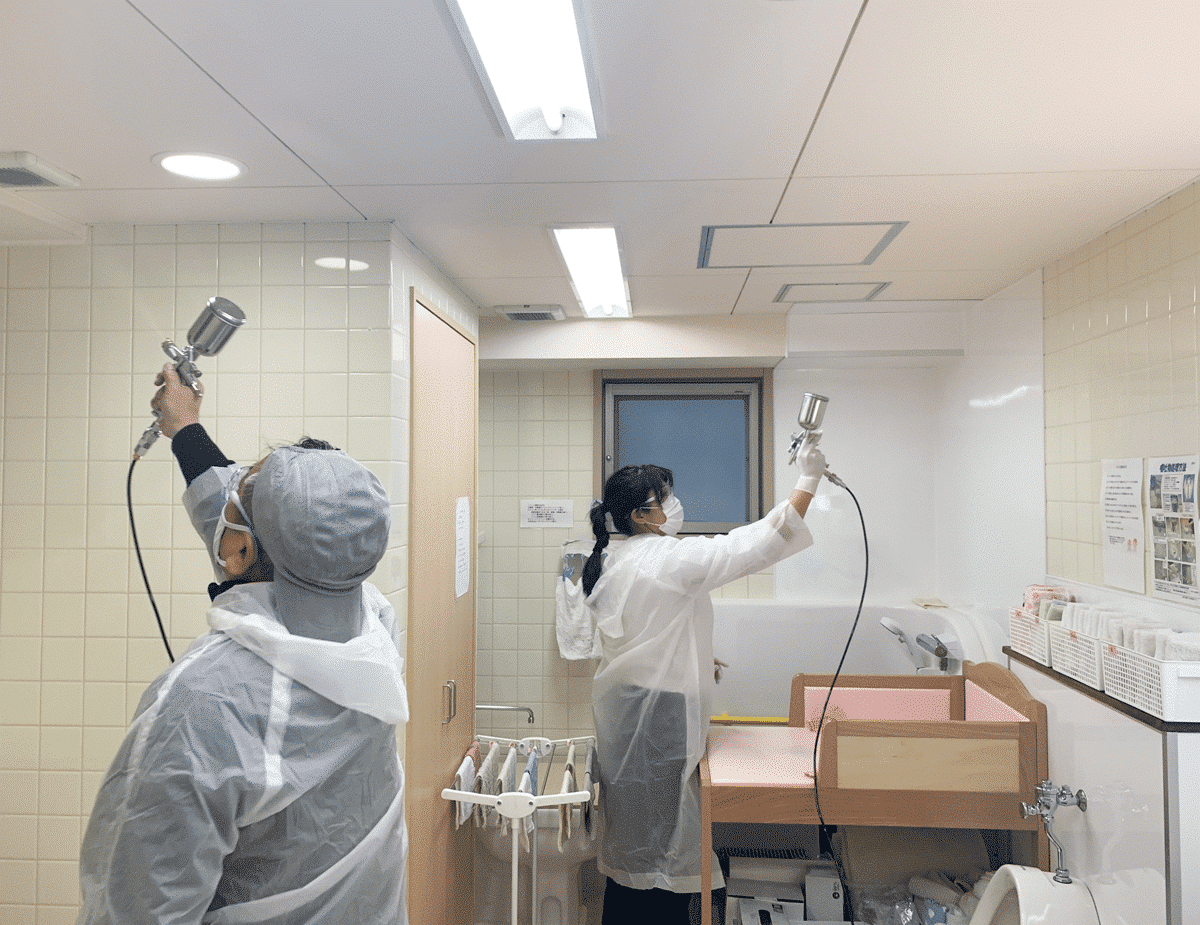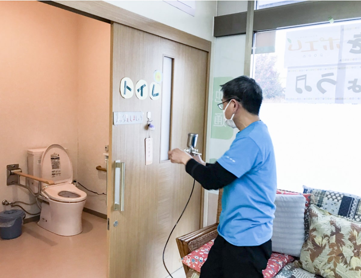 介護施設の利用者様は高齢ということもあり、より徹底した抗菌対策が必要です。トイレやレクリエーションスペース等すみずみまで施工しました。