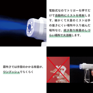 ワンプッシュで連続大量噴霧、拭き取りなしでらくらく抗菌!